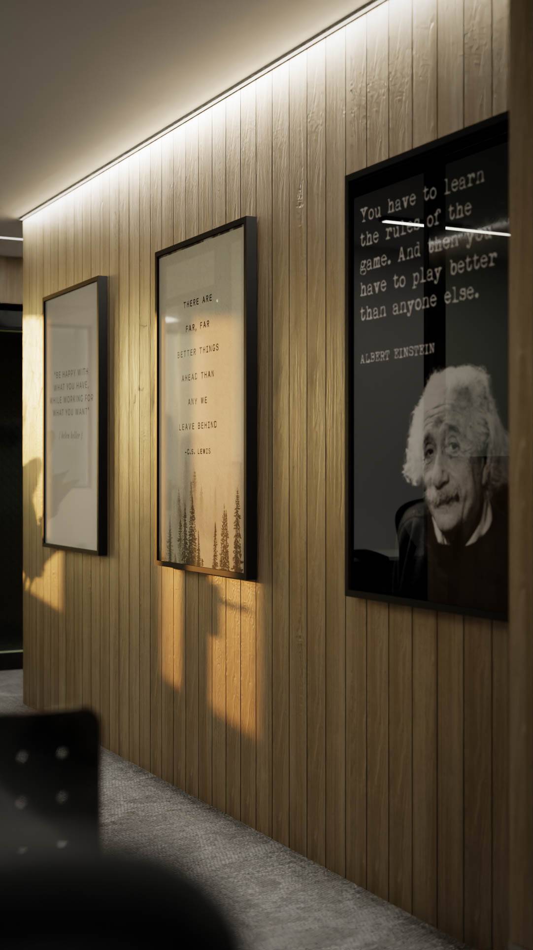 Feature Wall - The purpose of a warm-toned feature wall with 3 large posters serves as a strong contrast for the co-working space.The intention of doing so would convey the purpose and idea of the interior design - a tech office with a comfortable homelike atmosphere.