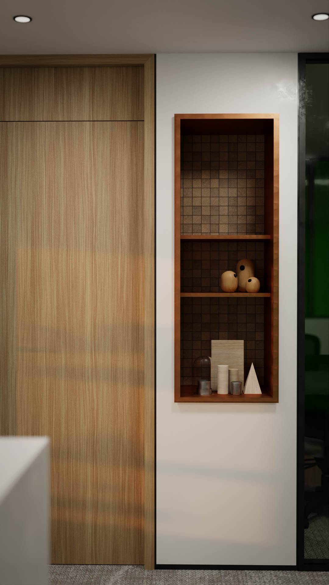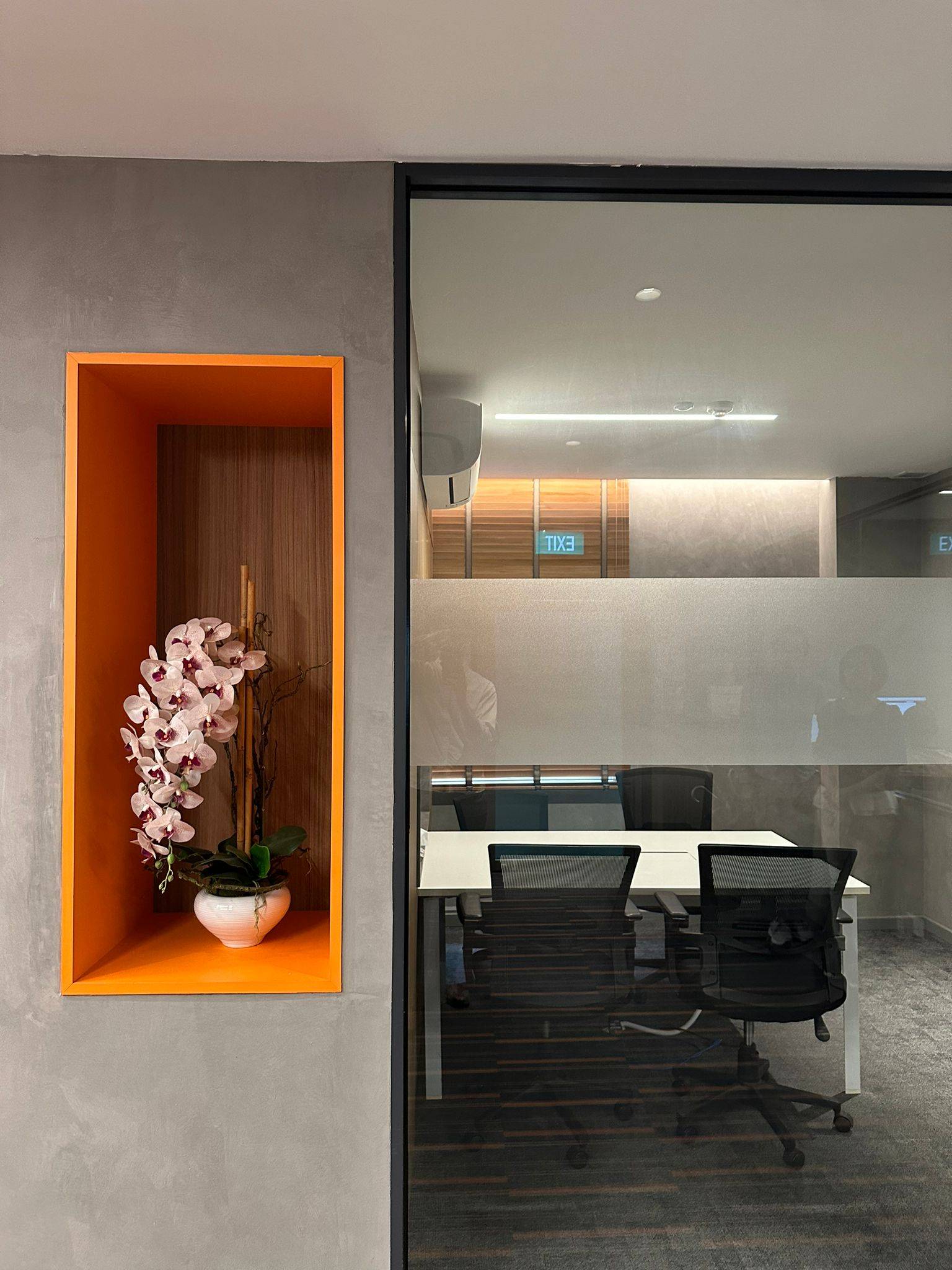 Color tones & detailings - A mixture of organic surfaces and textures were also introduced to the office to further implement the intention of providing a co-working space that feels homely for the staffs. The color scheme of creating a contrast by having a warm neutral base while injecting the corporate orange to subtle details like wood-like textures served its intention to juxtapose a technological office with a comfortable homelike atmosphere for the staffs.