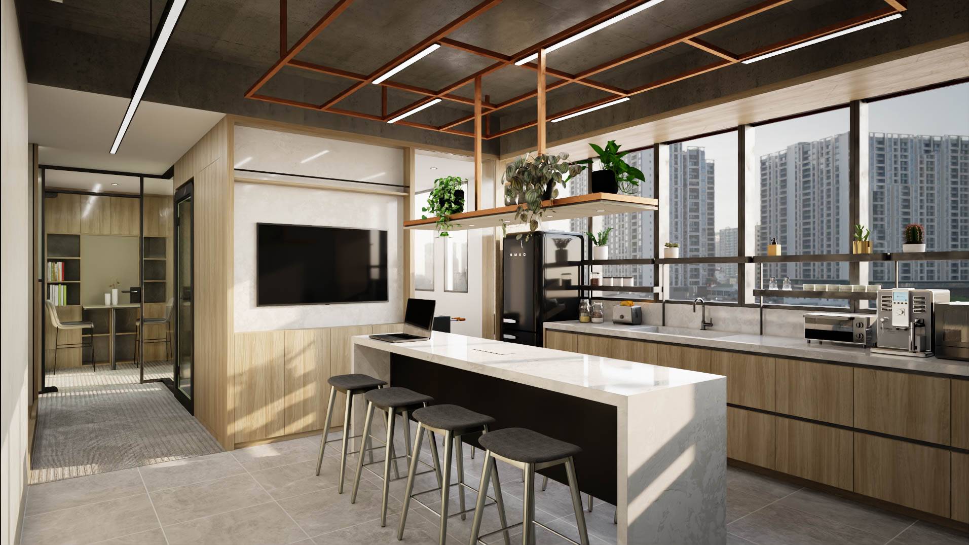 The placement of this pantry overlooks the wide windows structures and allows for natural light to enter the space - allowing for a space in the office to feel more breathable. This space is placed near the meeting rooms to provide a pre/post for meetings where one is able to prepare, cool down or even digest informations from the meeting.